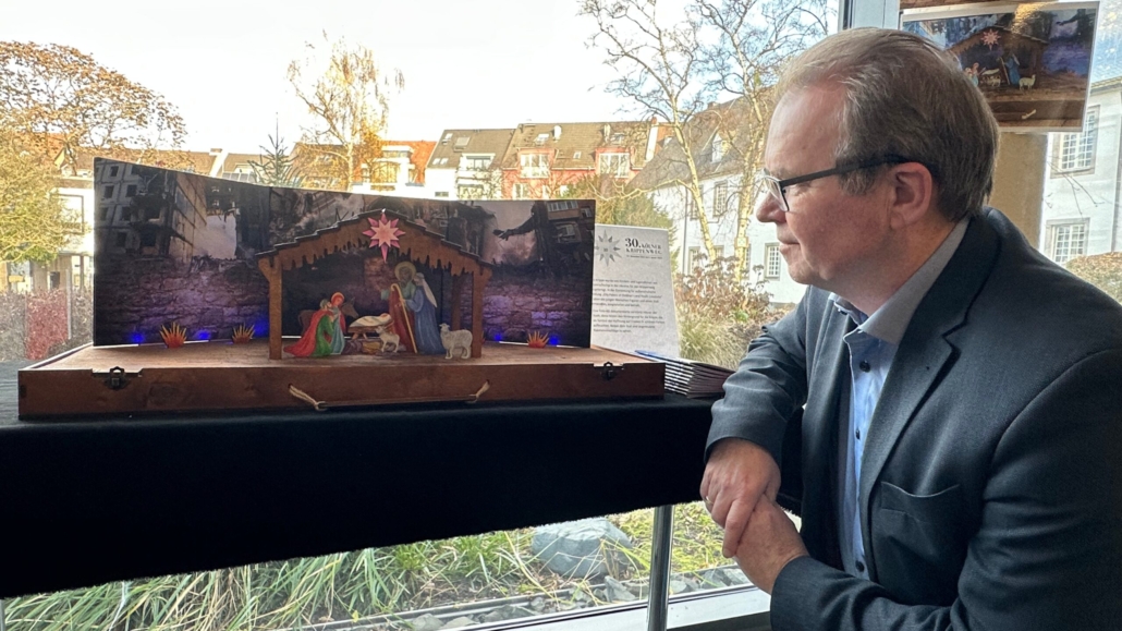 Bernhard Seiger: Es ist besonders, dass wir in diesem Jahr 30 Jahre Kölner Krippenweg feiern. Das ist eine ganz besondere Gelegenheit. Die meisten Krippen sind eher handwerklich anspruchsvoll gefertigt von Künstlerinnen und Künstlern, die mit den jeweiligen Materialien kunsthandwerklich wirklich Großartiges leisten. Das gilt jetzt hier für diese Krippe nicht, sondern das ist eine Krippe, die aus dem Alltagsleben heraus entstanden ist. Das ist vielleicht auch ihr besonderer Charme, dass sie eine Gegenwartskrippe ist, die die Weihnachtserfahrung auf dem Hintergrund einer echten bedrohlichen aktuellen Lebenssituation spüren lässt.