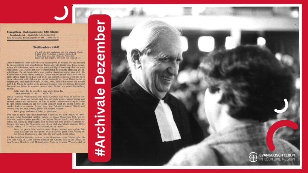 Vielleicht hatte Pfarrer Friedrich (Fritz) Wilhelm Schellenburg, als er sich 1948 mit einer Einladung zum Weihnachtsgottesdienst an die Mitglieder der Gemeinde Nippes wandte, etwas Ähnliches im Sinn. Er rief die Gemeindemitglieder dazu auf, sich trotz der schmerzlichen, entbehrungsreichen und verlustvollen Zeit der letzten Kriegs- und Nachkriegsjahre nicht der christlichen Botschaft zu verschließen, sondern der Ankunft Jesu mit Freude und offenem Herzen entgegenzusehen. Die Hoffnung und Zuversicht, die dem Advent innewohnen, sollten angenommen werden. Die Sorgen und Nöte des alten Jahres sollten – so gut es geht – losgelassen und ein neuer Anfang gewagt werden. Dabei sollten die Mitmenschen nicht aus dem Blick geraten, sondern Arme, Heimatlose und Kranke aktiv in den Blick genommen werden. Schellenburg appellierte an die Nächstenliebe und das Bedürfnis nach Halt und Gemeinschaft.